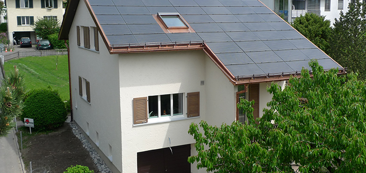 Herzstück des Energiekonzeptes, welches die Bezeichnung „Plusenergiehaus“ ermöglicht, ist eine 14.8 kWp Photovoltaikanlage. Zielsetzung bei der Projektierung war eine ästhetisch hervorragende Anlage zu erstellen, welche zur Nachahmung anregt. Die Anlage fügt sich sehr gut in die Dachlandschaft des Wohnquartiers ein. Der architektonische Charakter des Hauses bleibt in moderner Form erhalten.